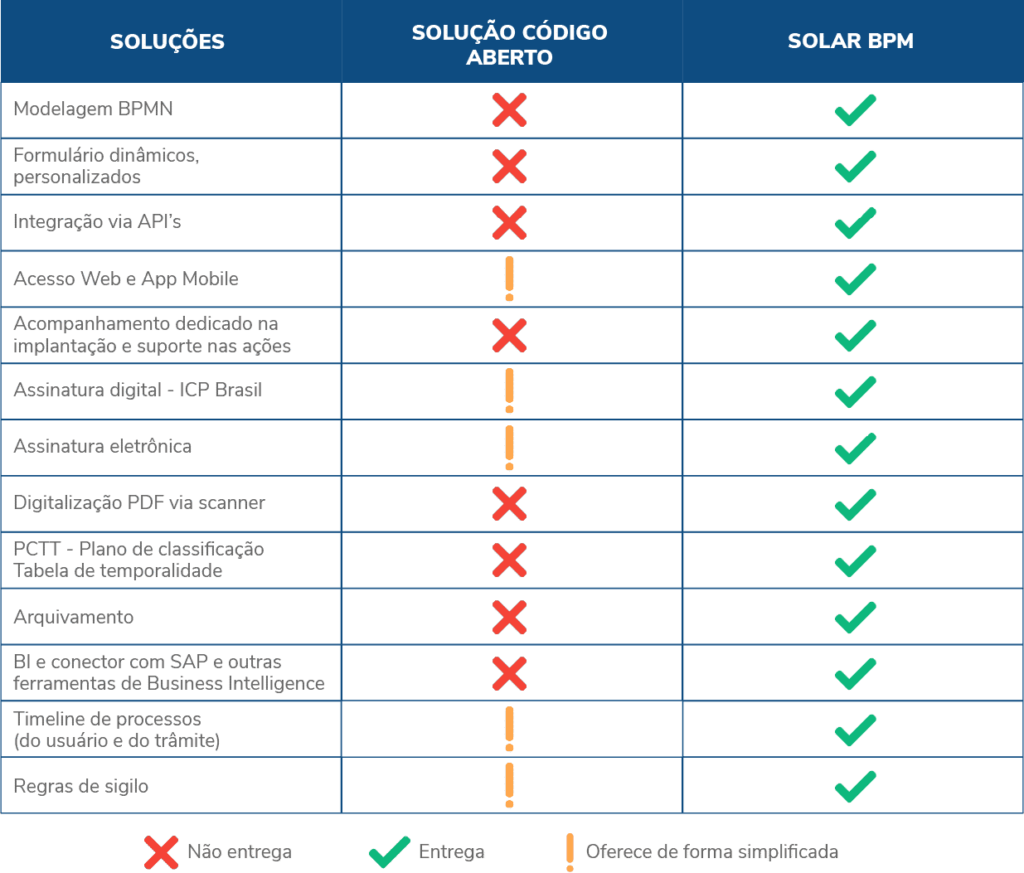 Confira o comparativo das principais funcionalidades: solução de código aberto versus Solar BPM
