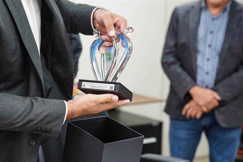 O troféu foi entregue por Adriano Marra, coordenador da equipe residente da Softplan no DER-DF, em um momento que simbolizou a relevância da trajetória construída ao longo de décadas de colaboração.