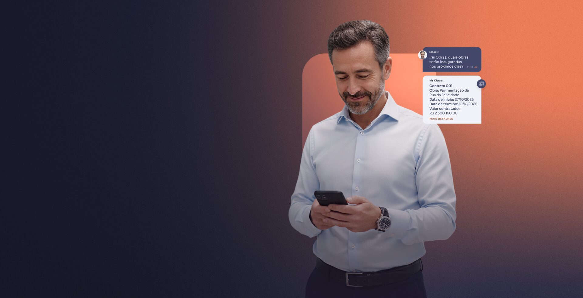 Iris Obras responde sua pergunta no WhatsApp, consultando a base de dados da instituição. Usa IA conversacional e entende perguntas em linguagem natural, dando respostas simples e diretas.